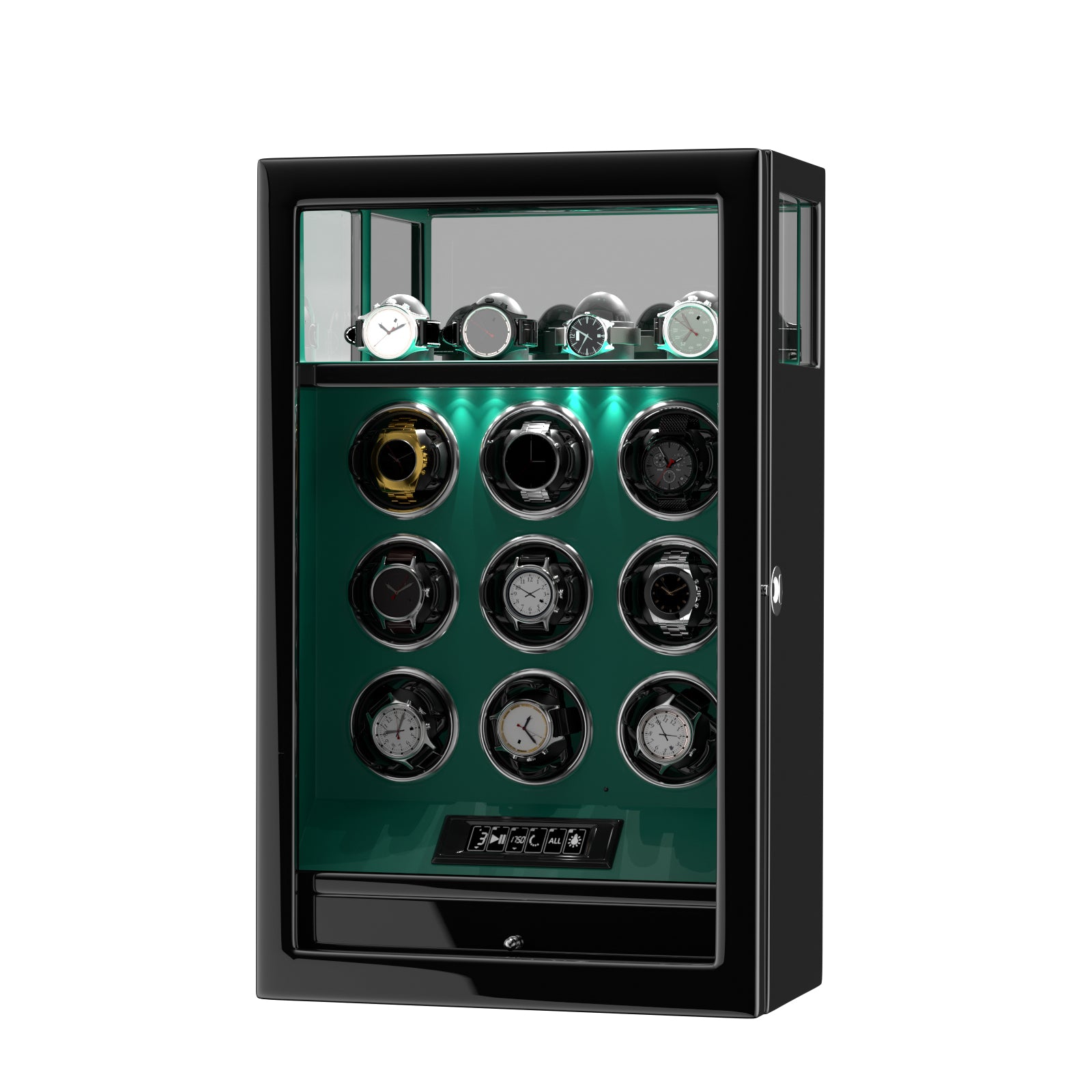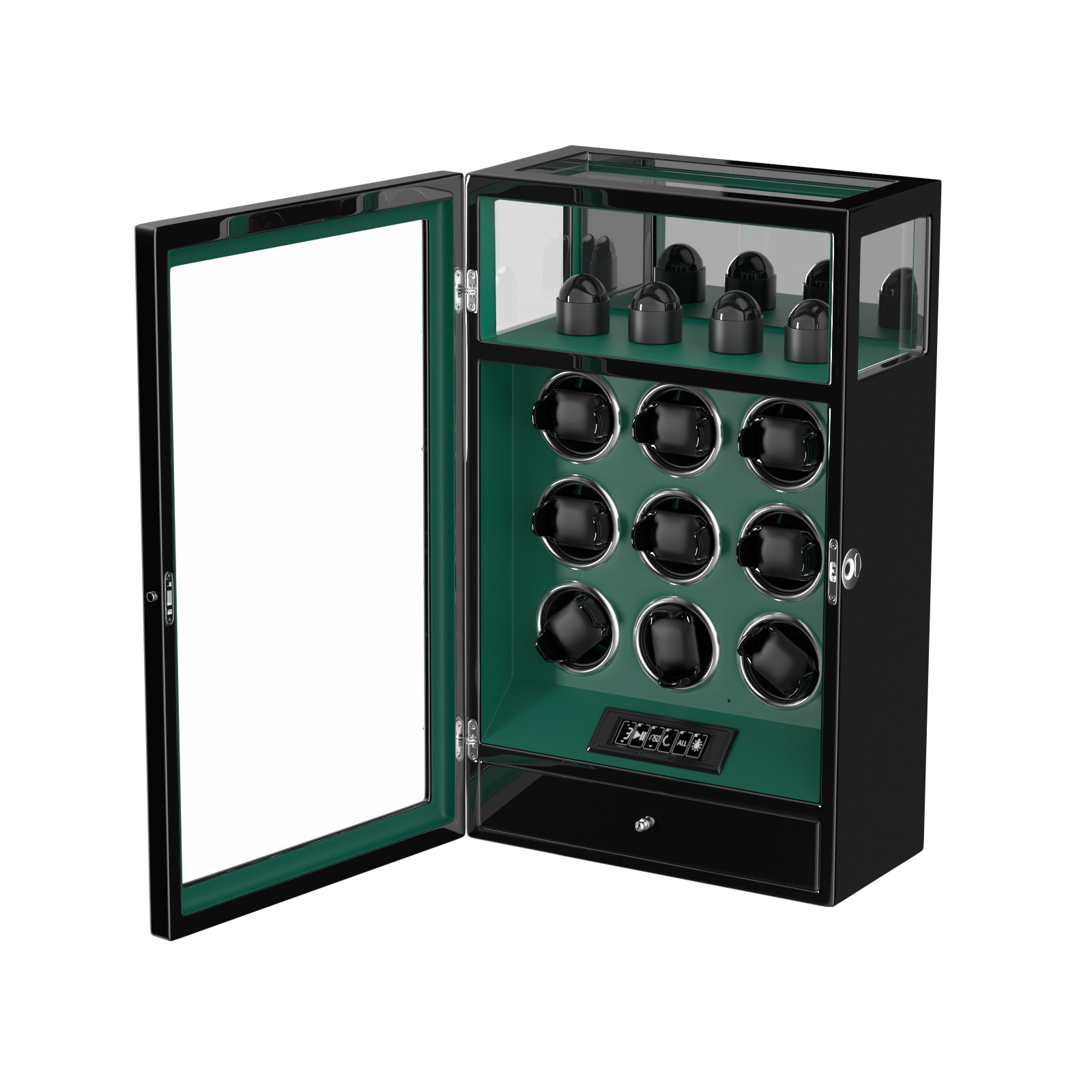 2026 IQ+ Serie - Patentierter, Intelligenter 9 Slot Uhrenbeweger | mit Tastensperre | Extra Standfläche für Schmuck | Schublade für weiteren Stauraum | LCD Touch Display | in Grün