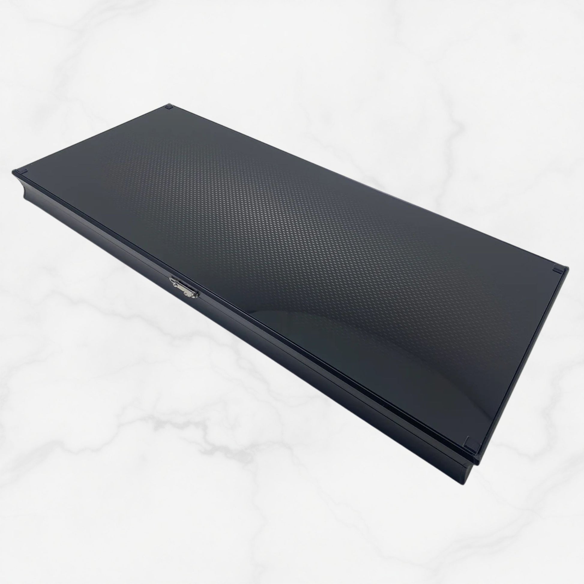 Reine Eleganz und moderne Raffinesse – dieses hochwertige Backgammon-Board überzeugt durch sein minimalistisches Design mit einer Carbonfaser-Textur auf glänzend schwarzem Hintergrund. Gefertigt aus robustem, gehärtetem Glas und eingefasst in einen eloxierten Aluminiumrahmen, bietet das Spielbrett starke Kontraste und einen futuristischen Look. Die geöffneten Maße betragen 61 × 53 cm, und die 3 cm großen Spielsteine bestehen aus Designer-Acryl mit Filzunterseite für ein besonders sanftes und leises Spielerlebnis.